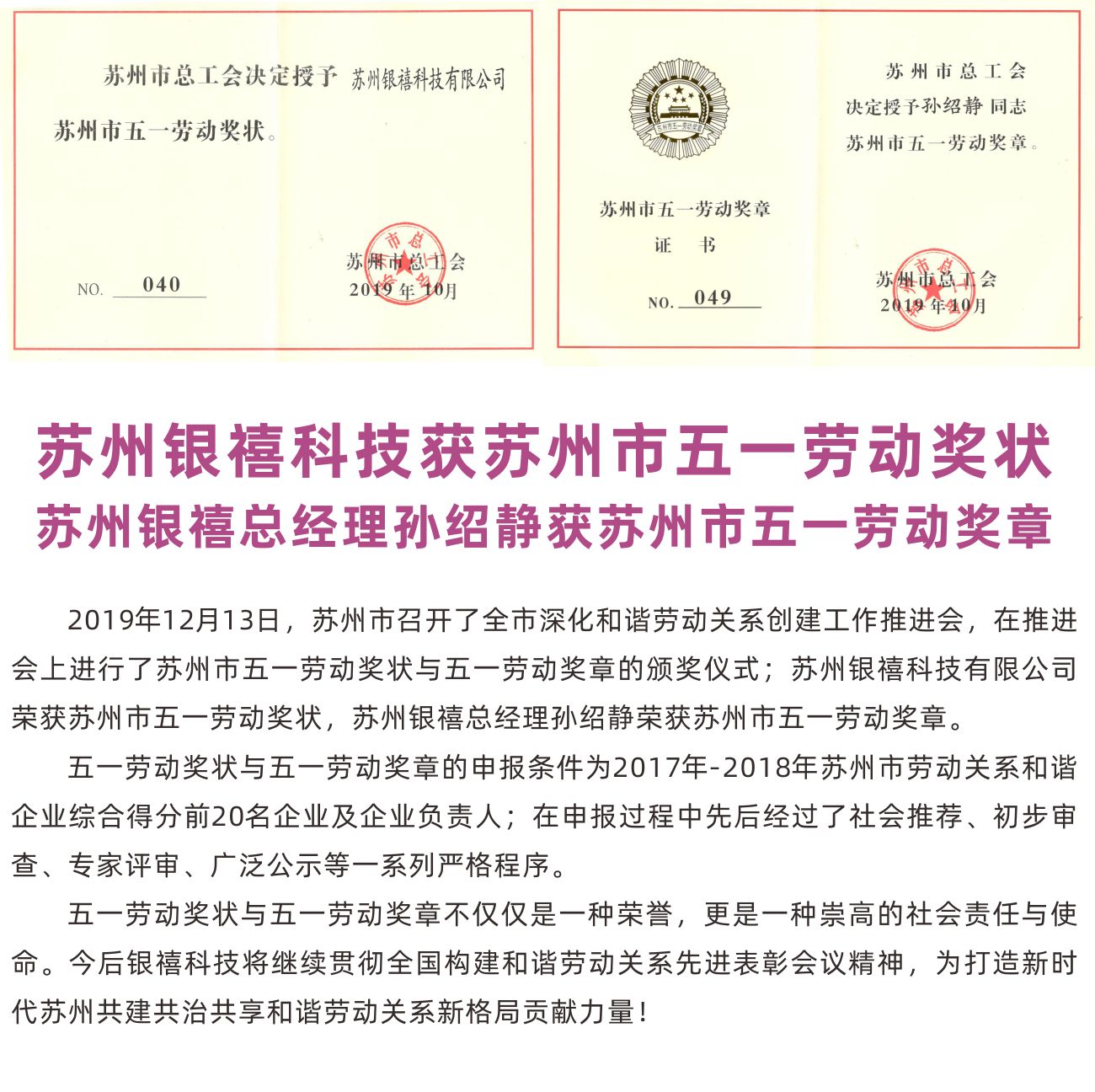 苏州银禧获苏州市五一劳动奖状,孙绍静获苏州市五一劳动奖章